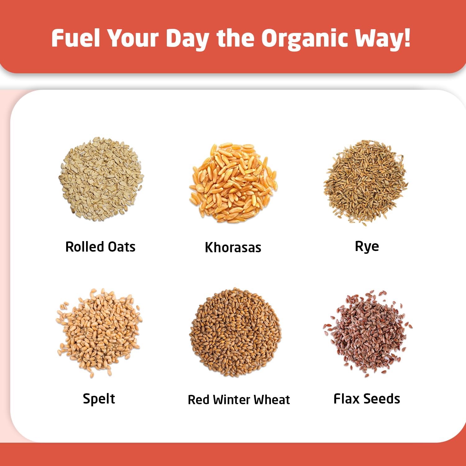 Organic oats, organic Kamut® khorasan, organic spelt, organic rye, organic hard red wheat and organic flax seeds.