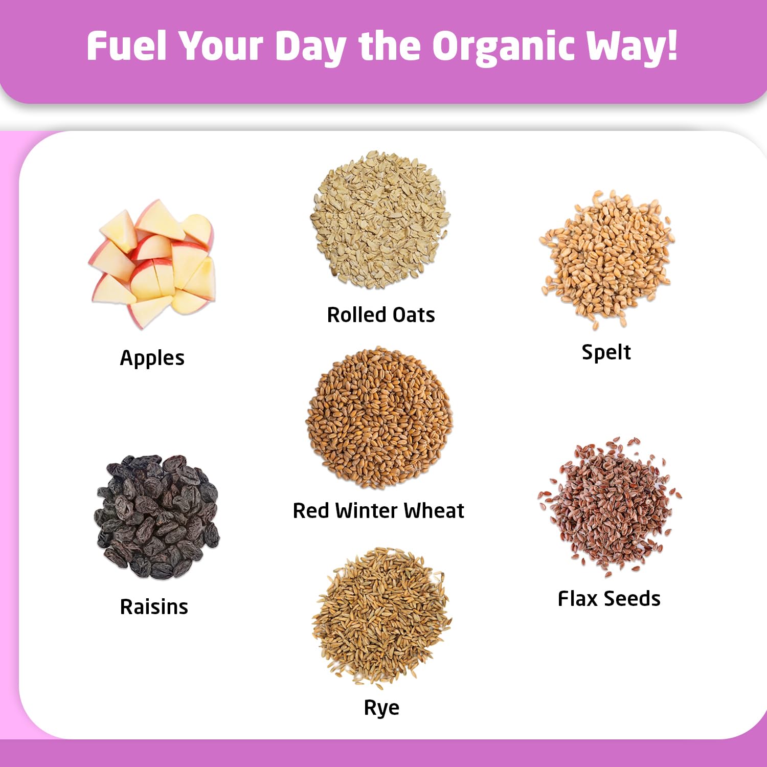 Organic Oats, Organic Hard Red Winter Wheat, Organic Rye, Organic Raisins, Organic Spelt, Organic Apples, Organic Flax Seeds