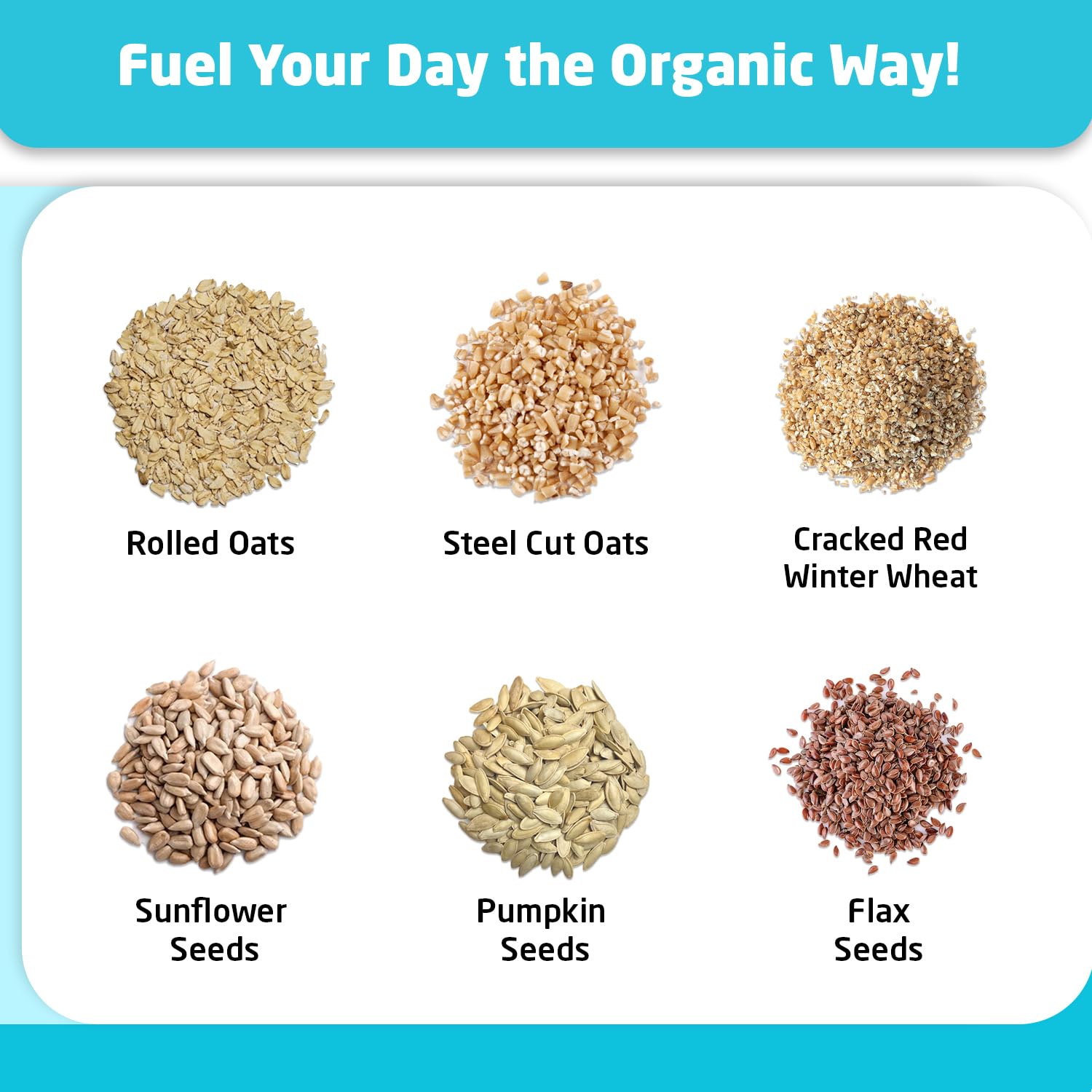 Organic Rolled Oats, Organic Steel Cut Oats, Organic Cracked Red Winter Wheat, Organic Sunflower Seeds, Organic Flax Seed, Organic Pumpkin Seeds, Organic Oat Bran